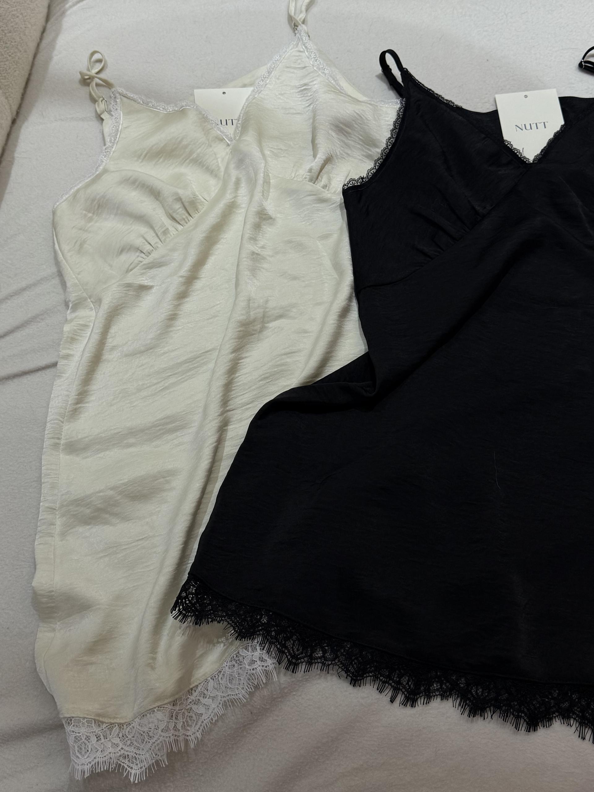 하늘하늘 가볍게 떨어지는 슬립 라인 레이어드 드레스로 어깨끈 조절이 가능하며