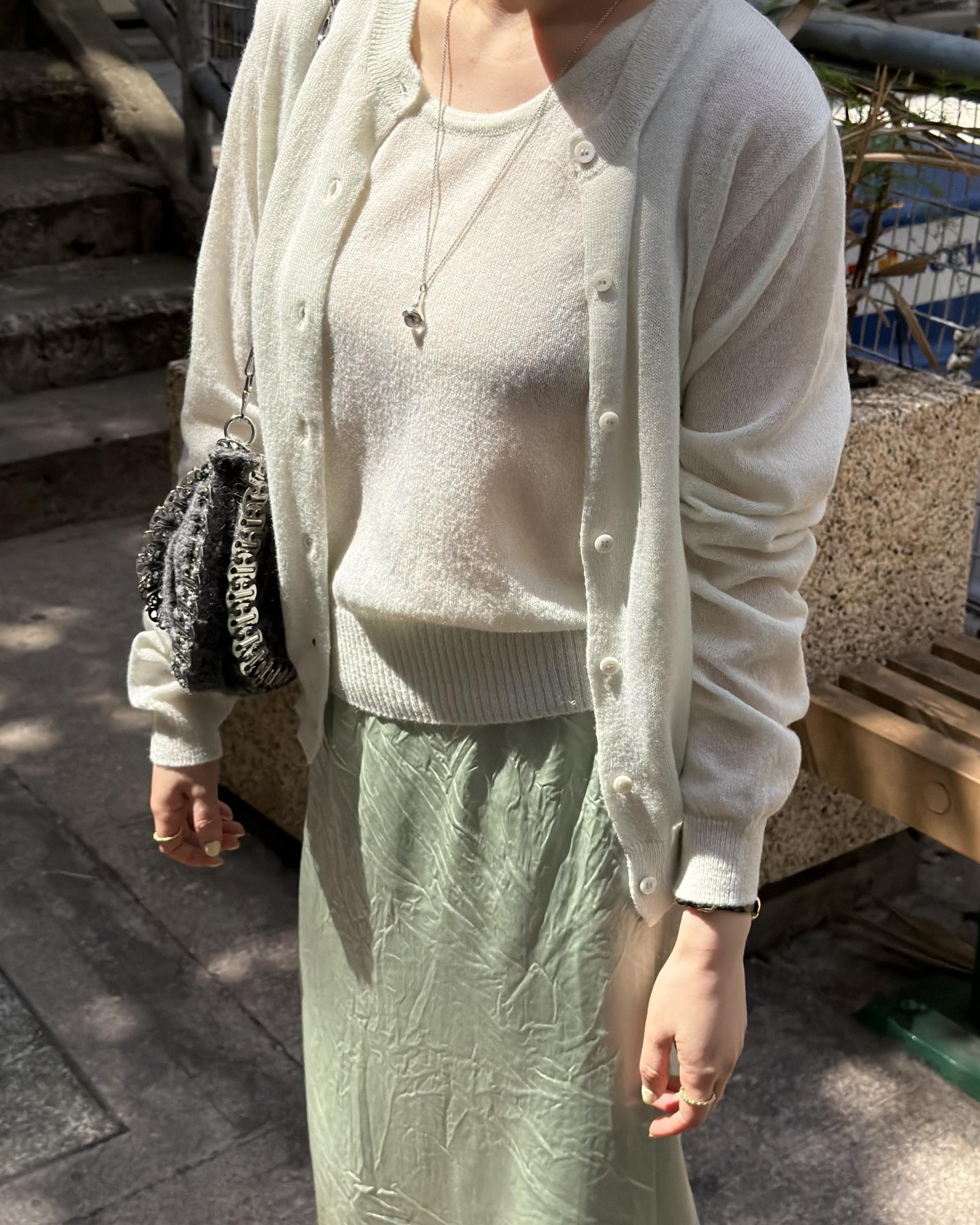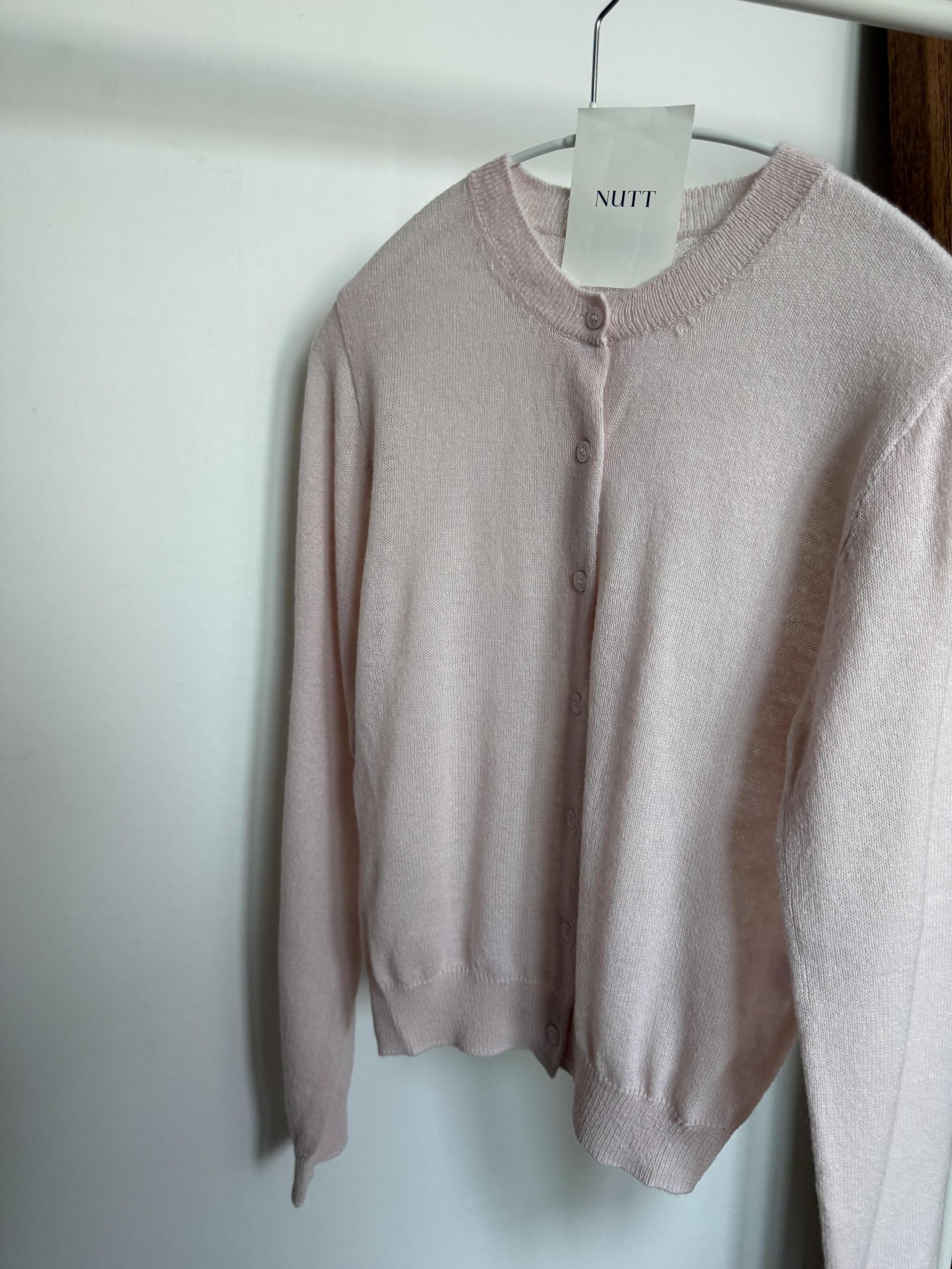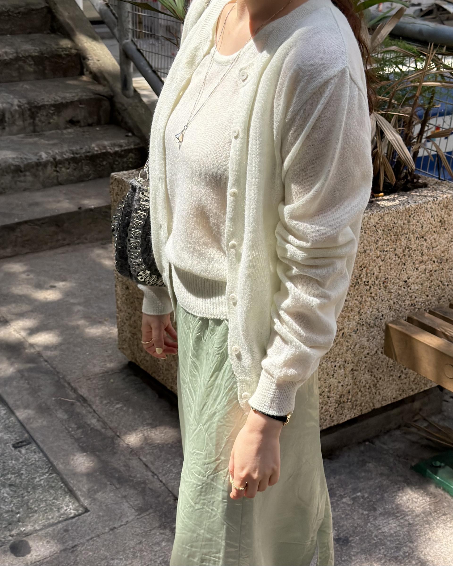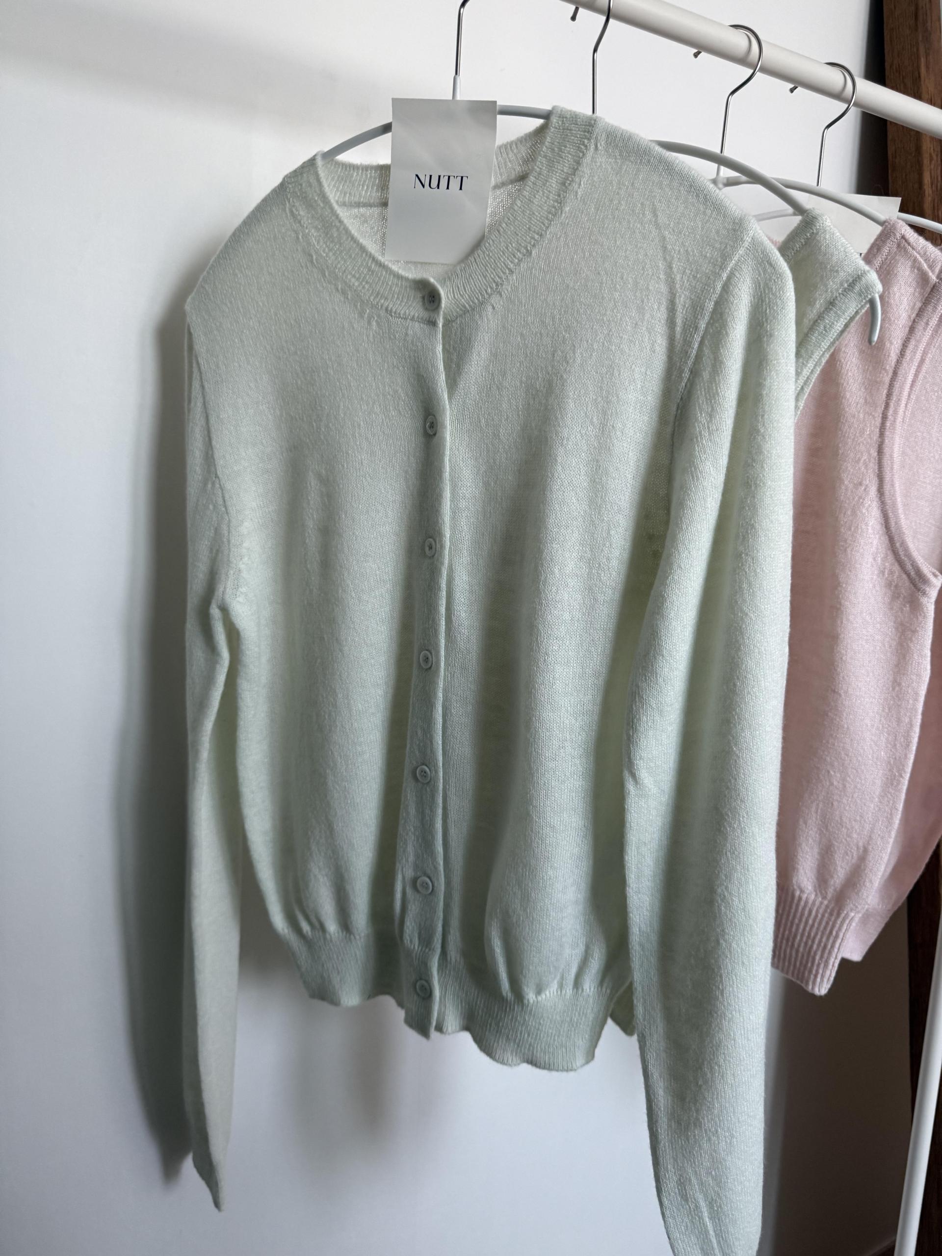 가디건 컬러와 어울리는 자개 단추가 사랑스러움을 더해줍니다.