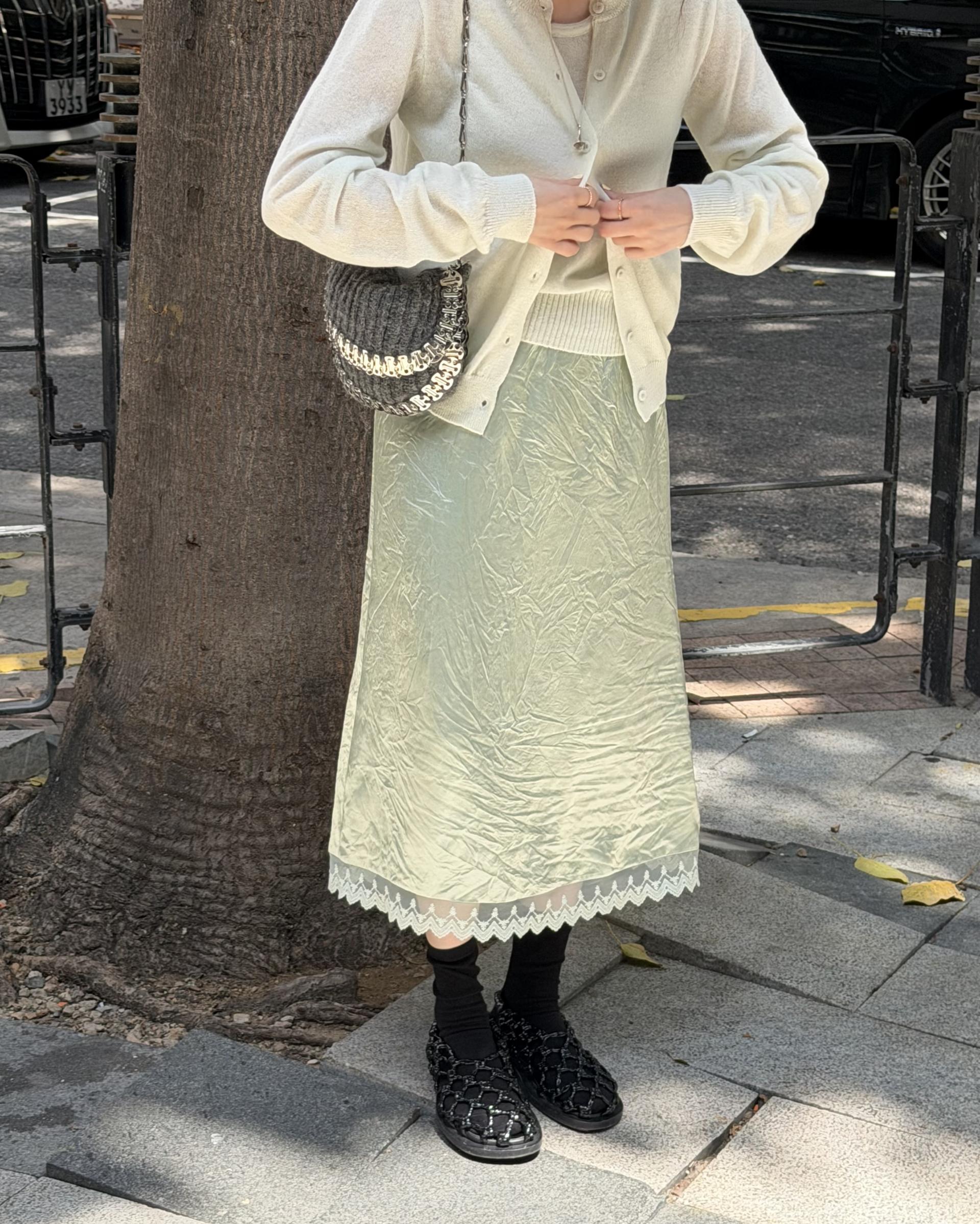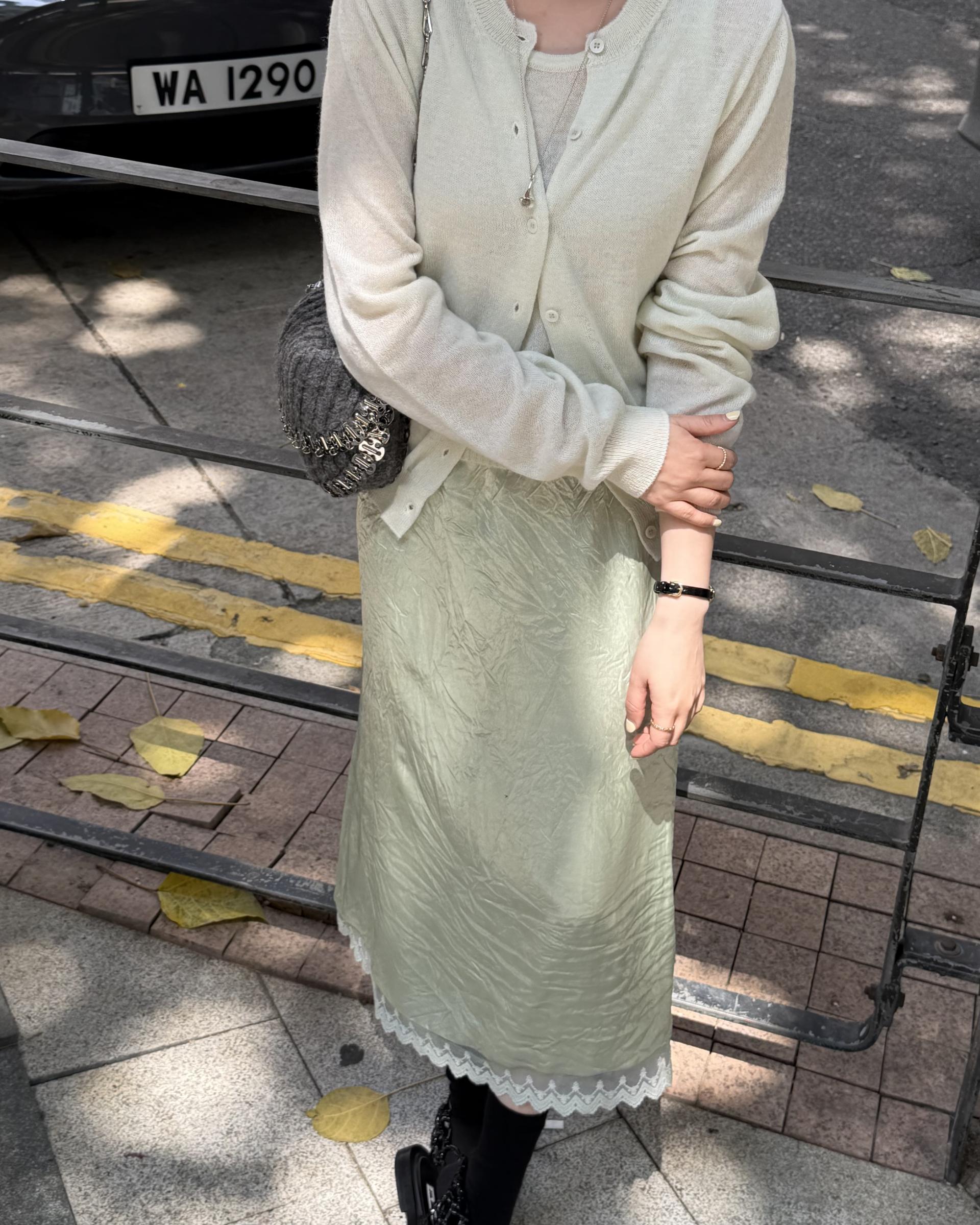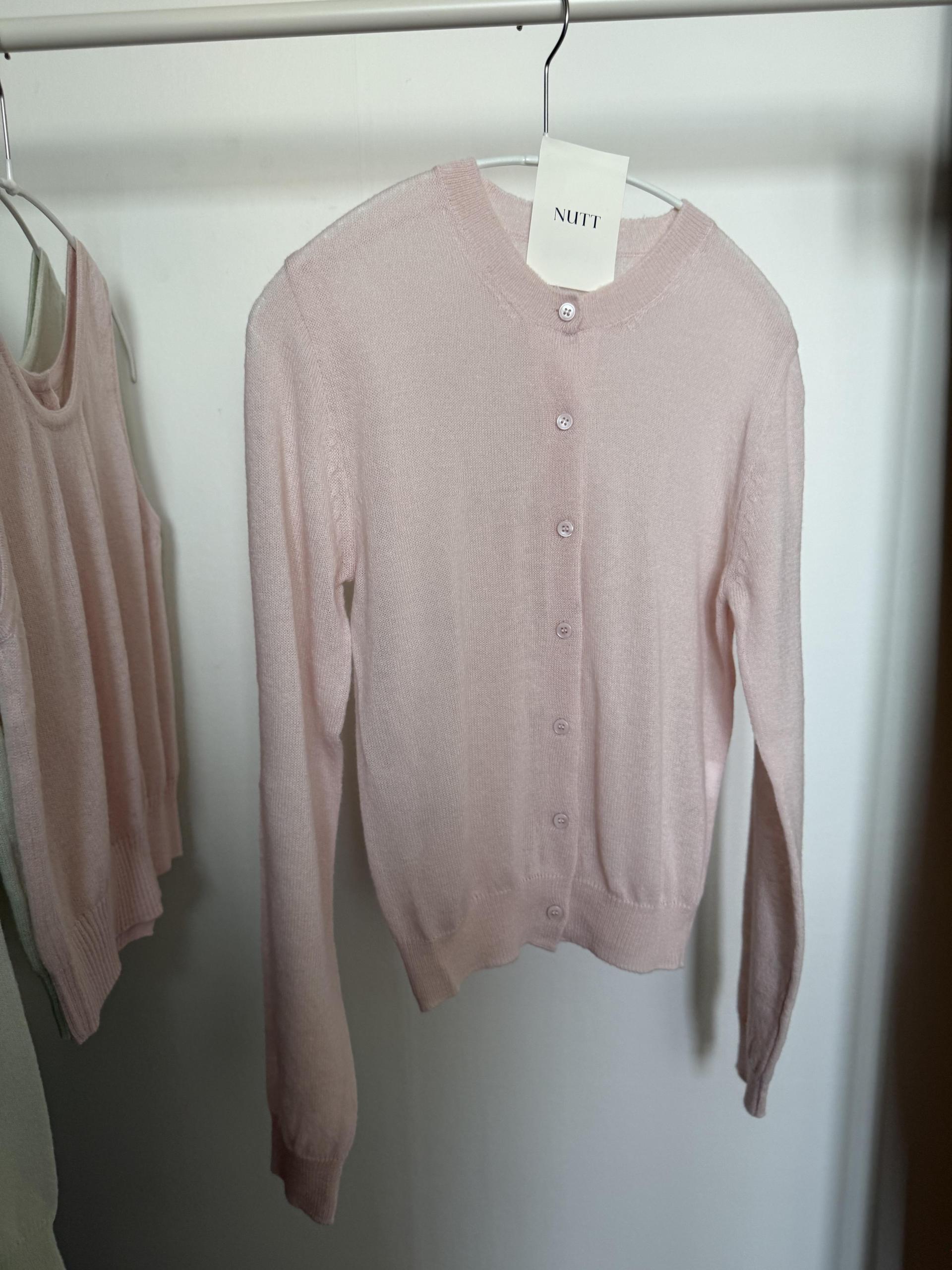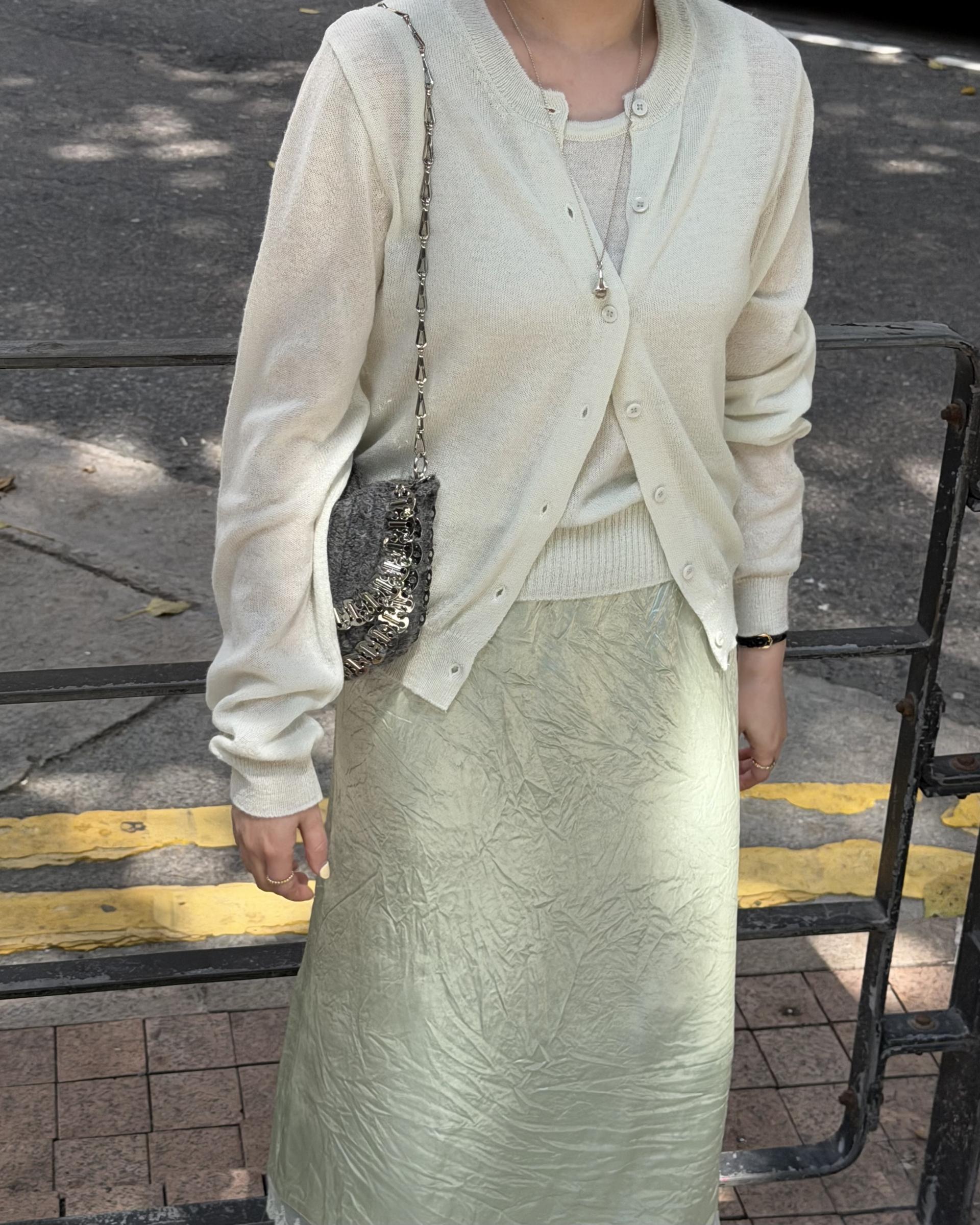 가디건 컬러와 어울리는 자개 단추가 사랑스러움을 더해줍니다.