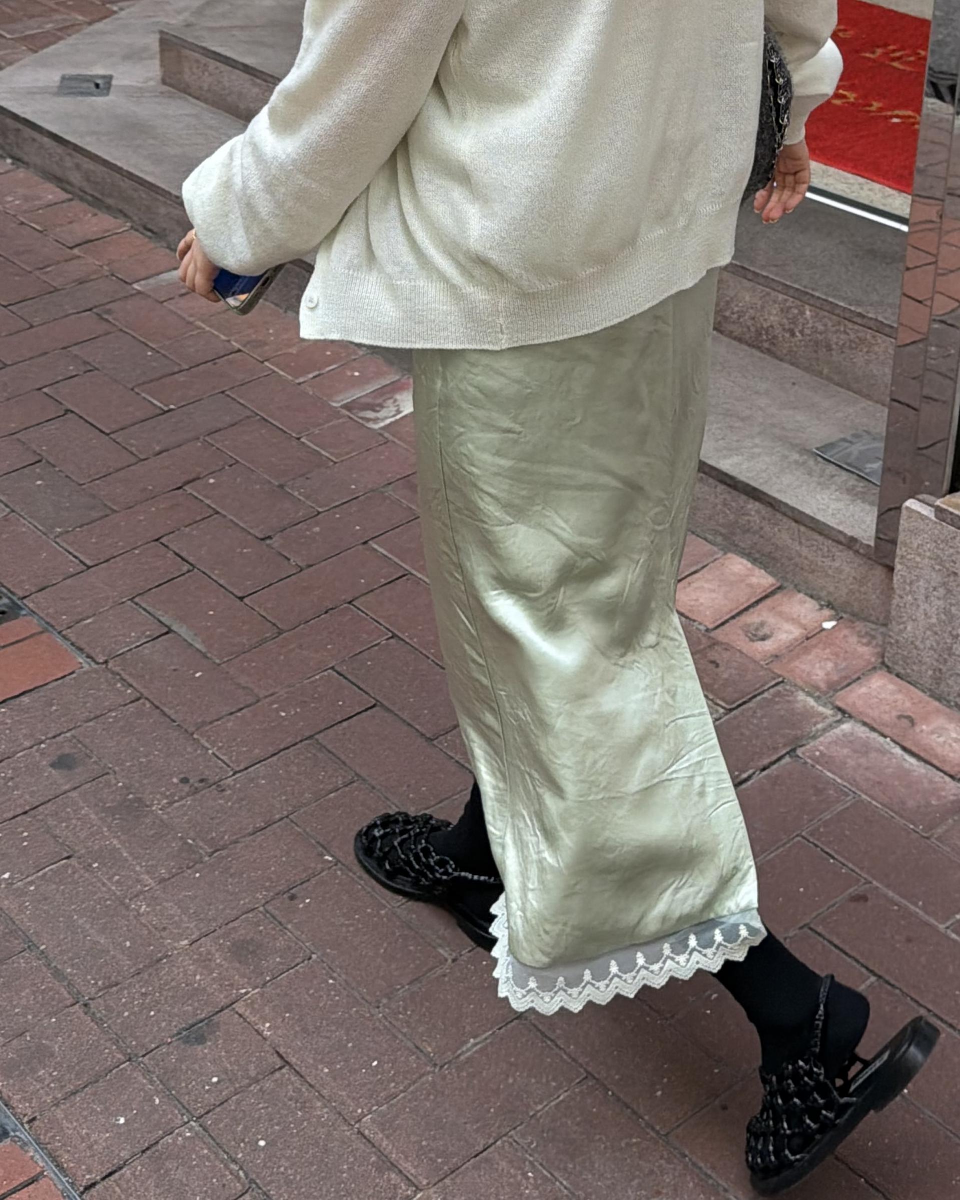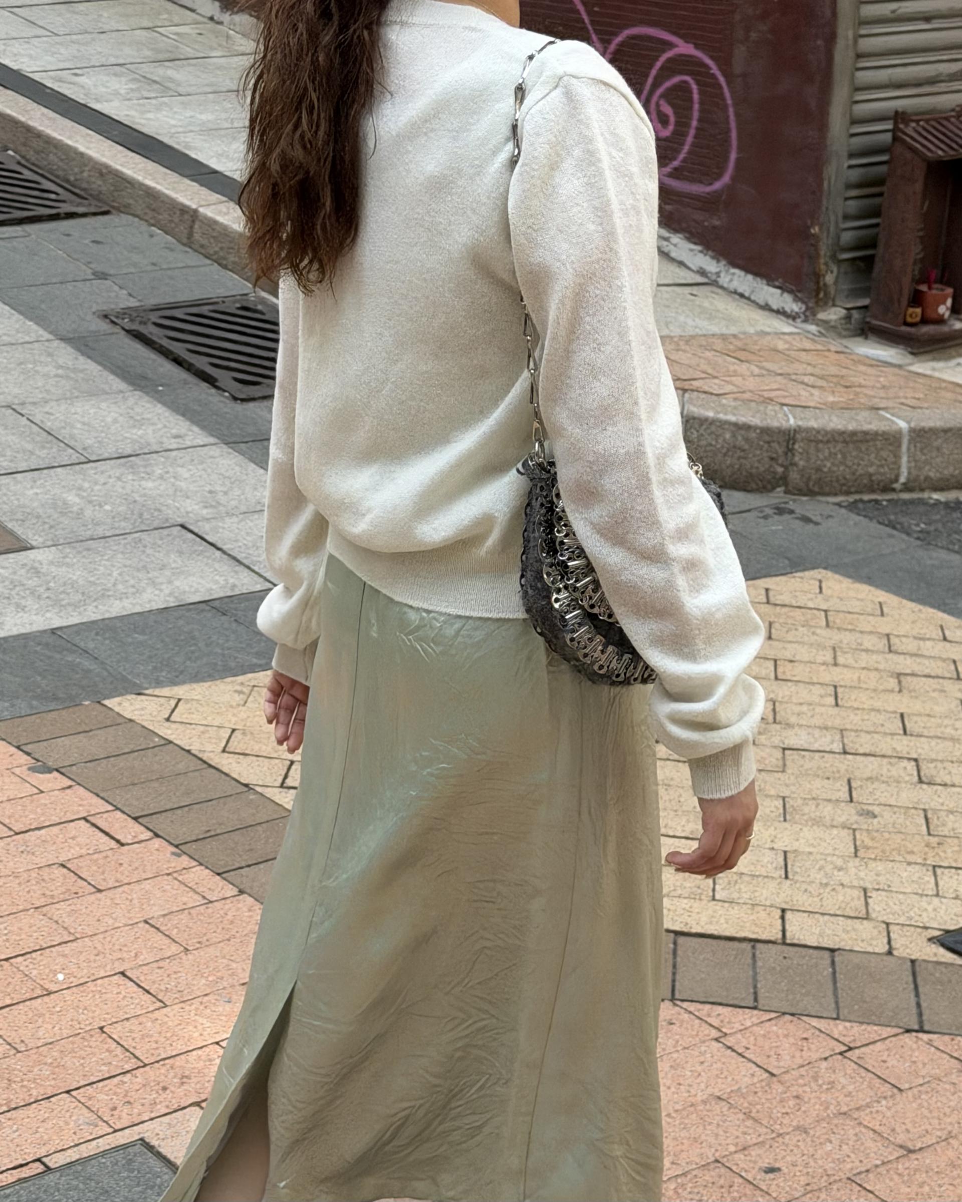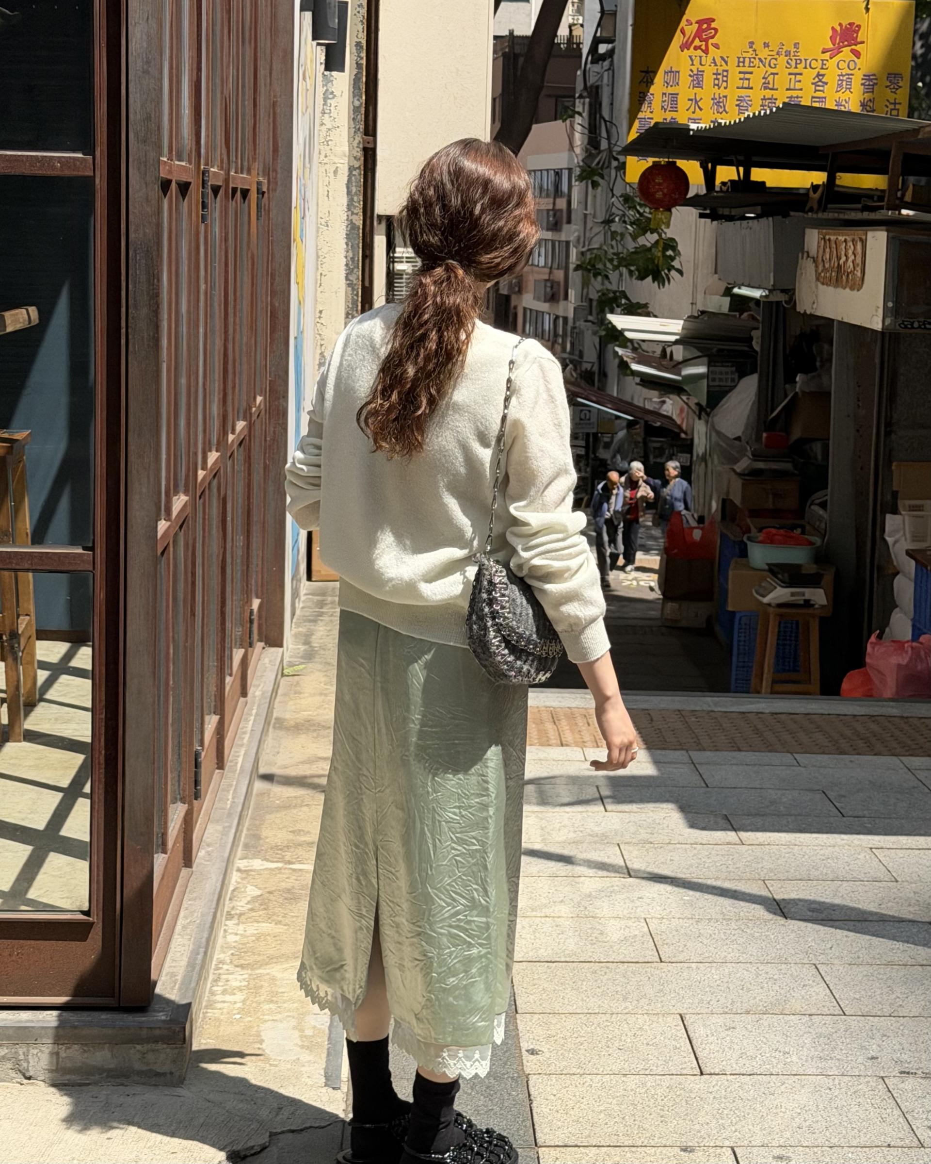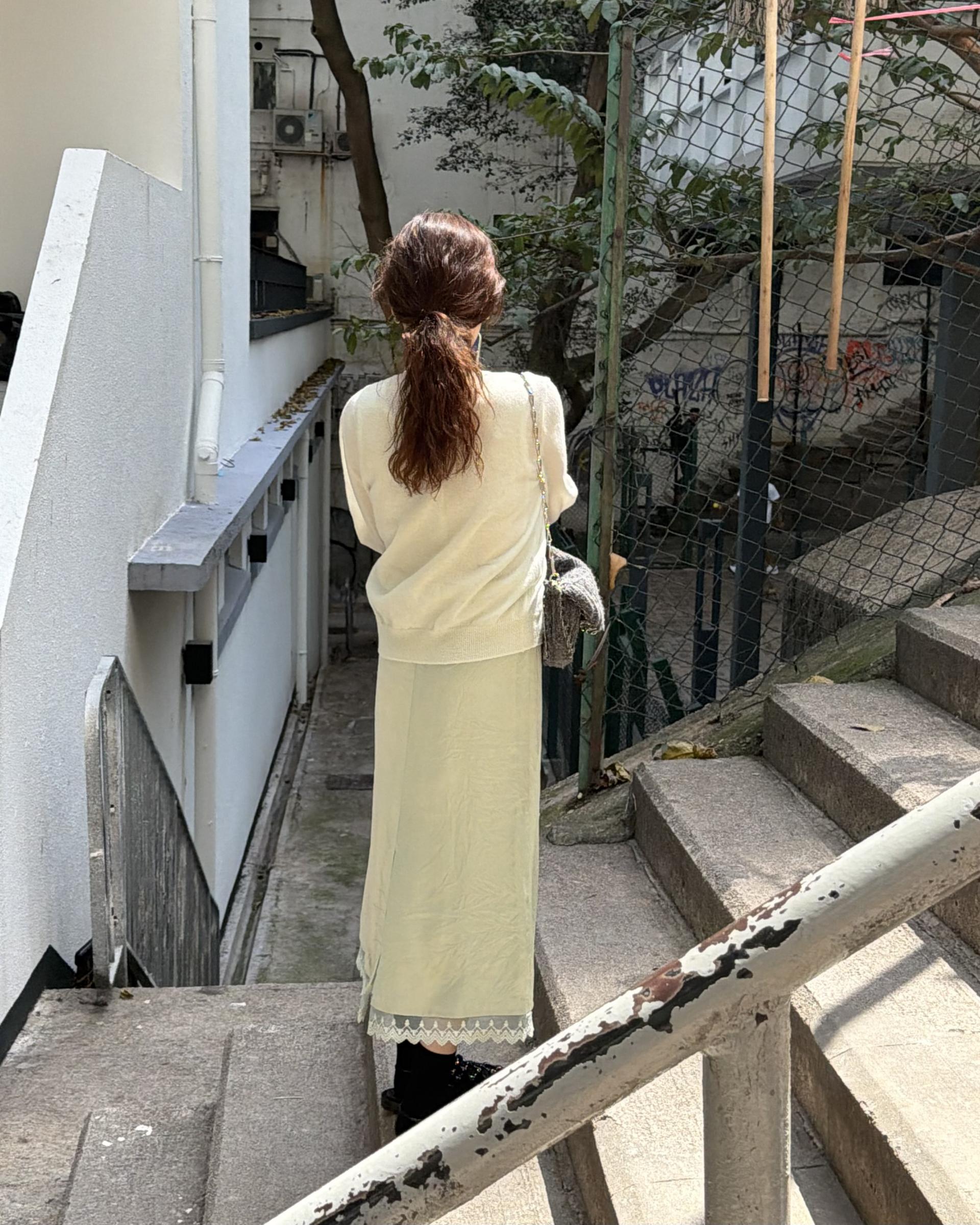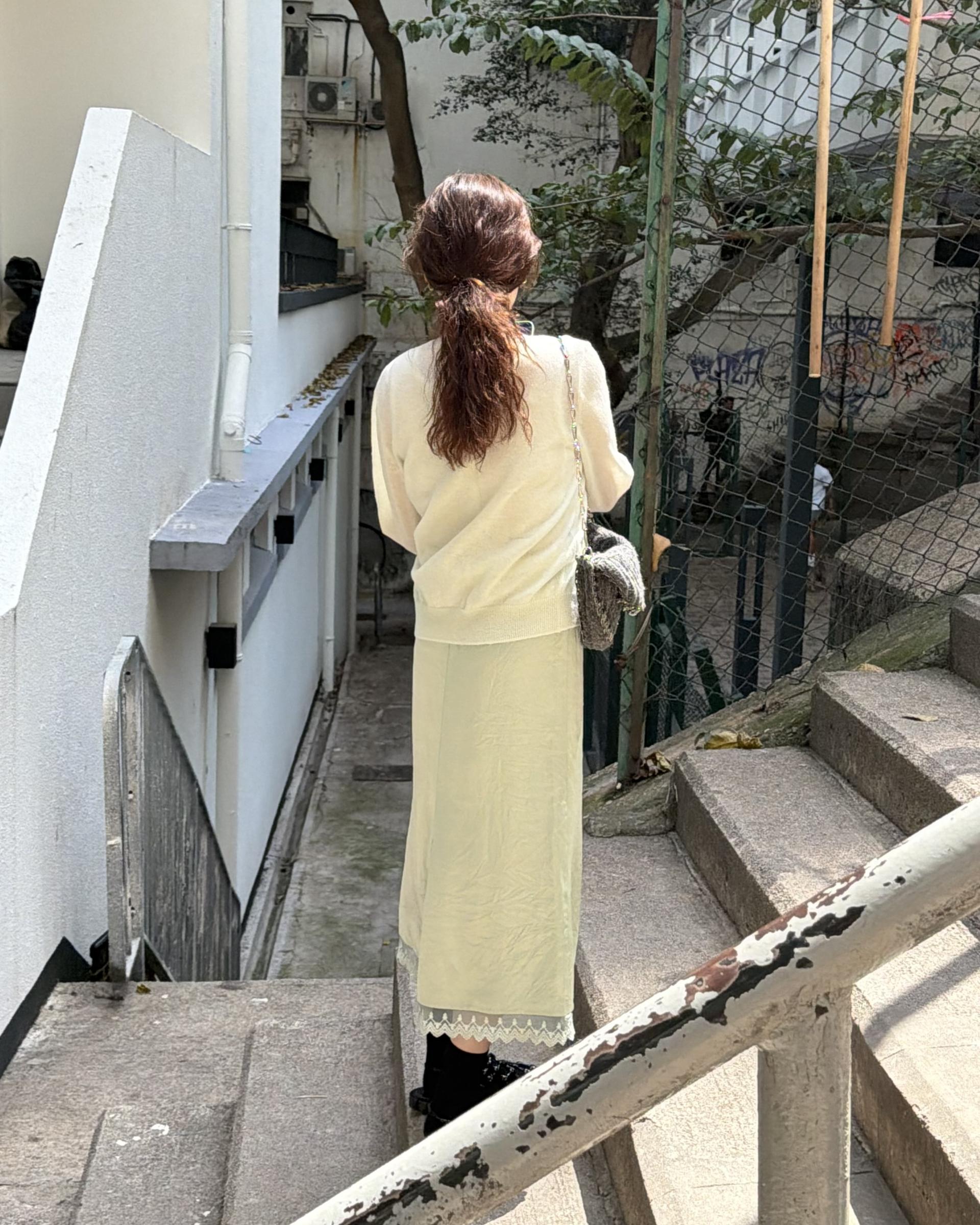 가디건 컬러와 어울리는 자개 단추가 사랑스러움을 더해줍니다.