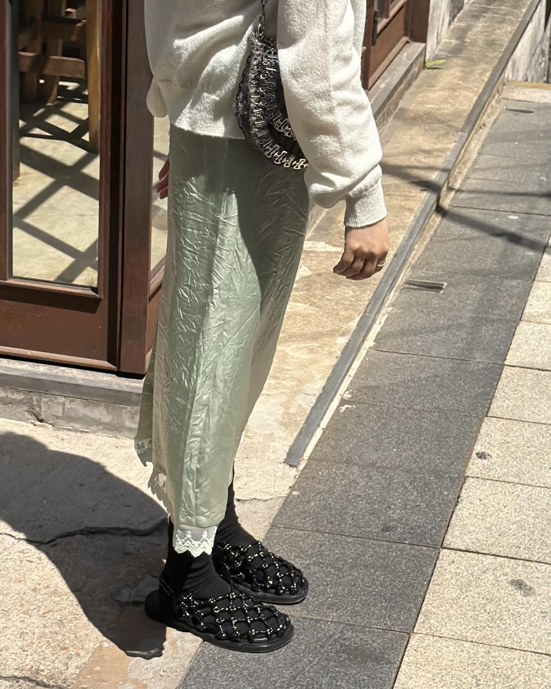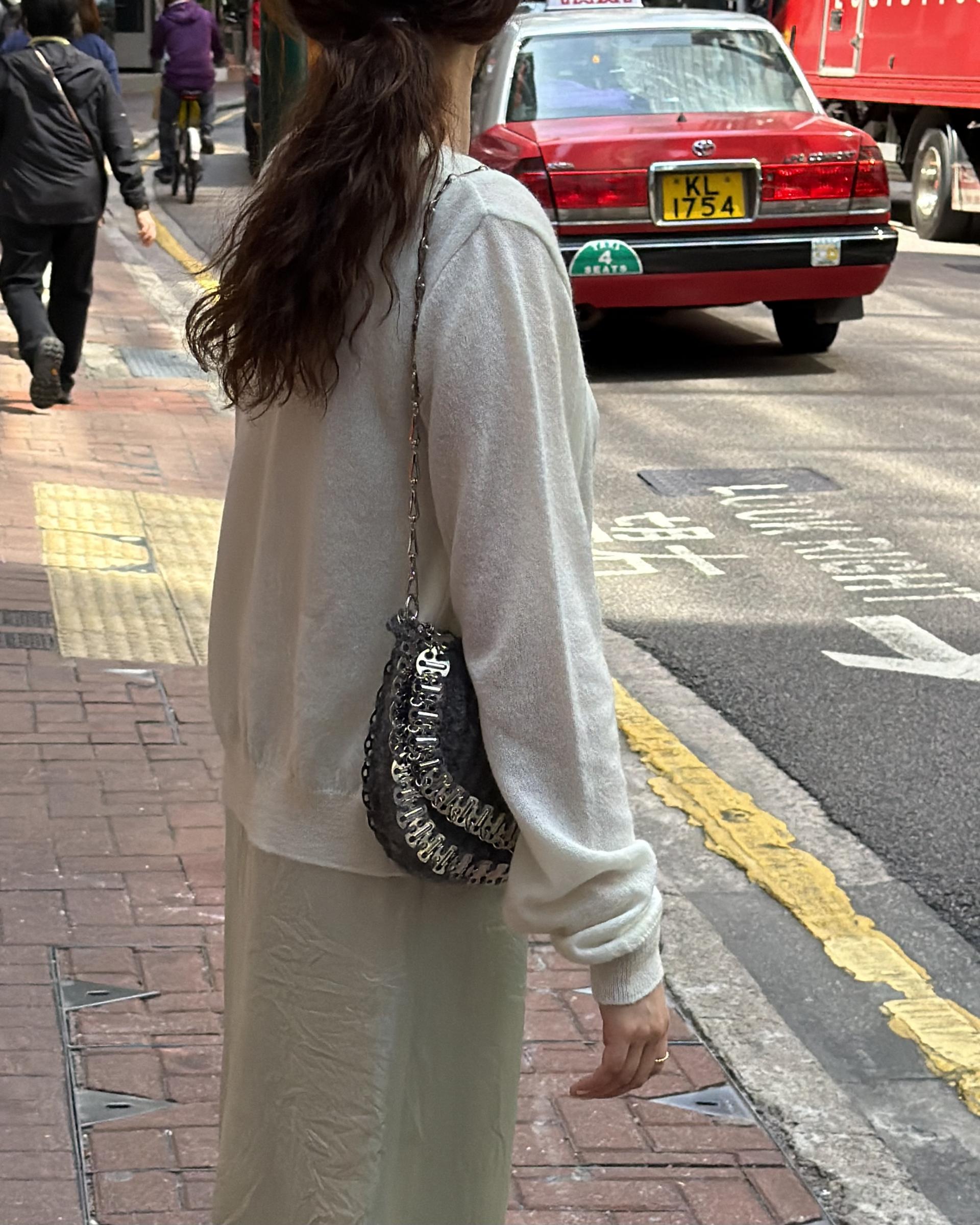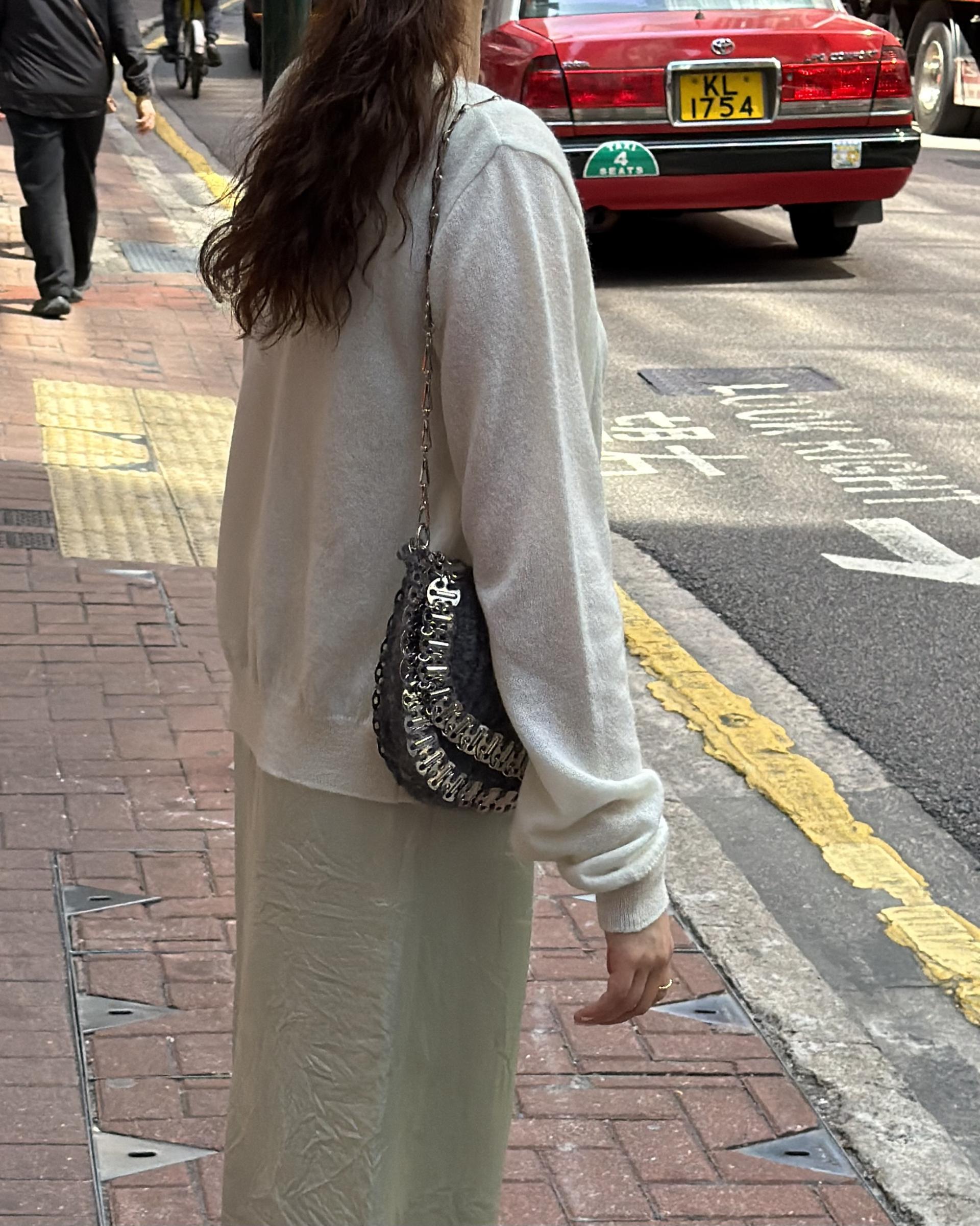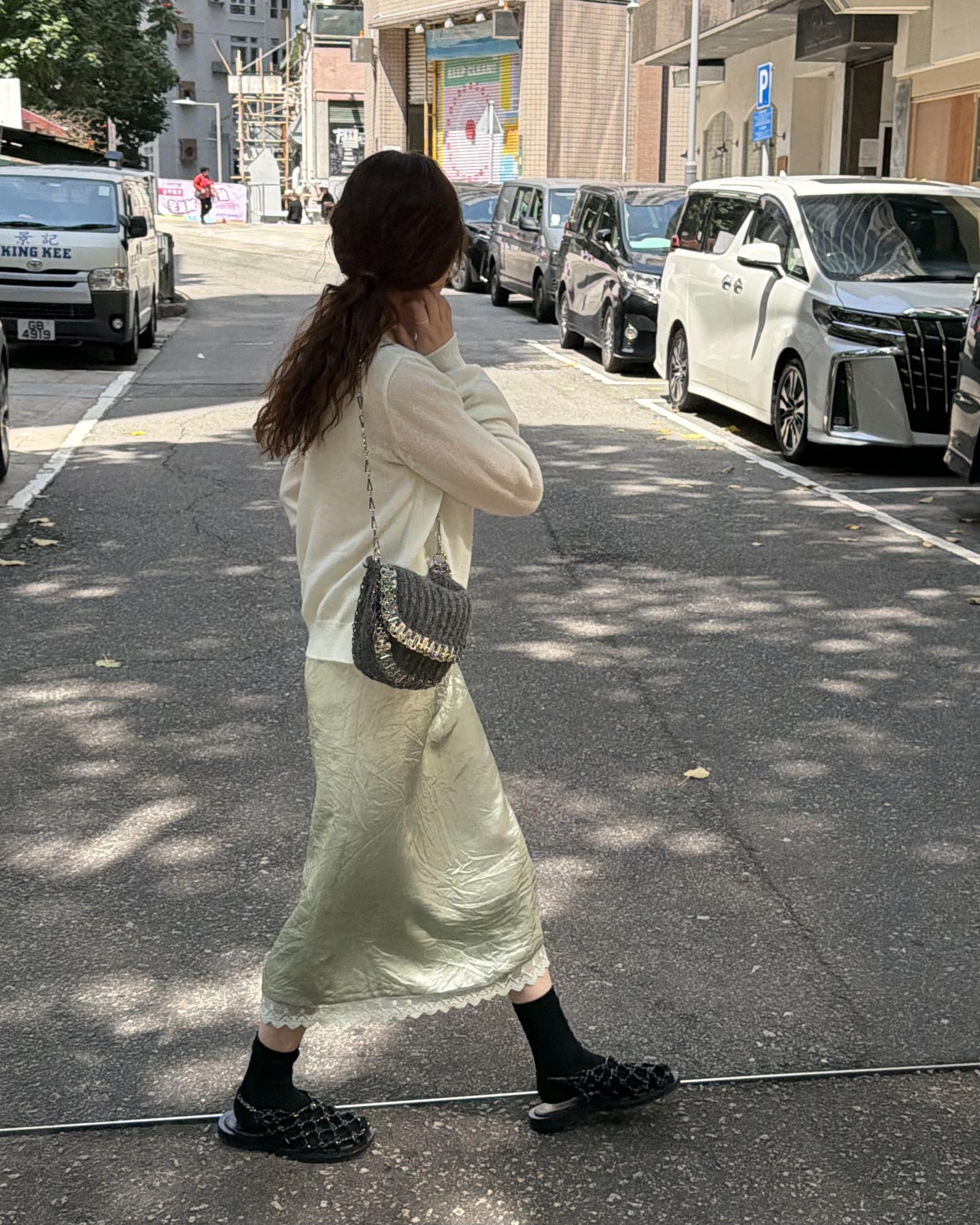 가디건 컬러와 어울리는 자개 단추가 사랑스러움을 더해줍니다.