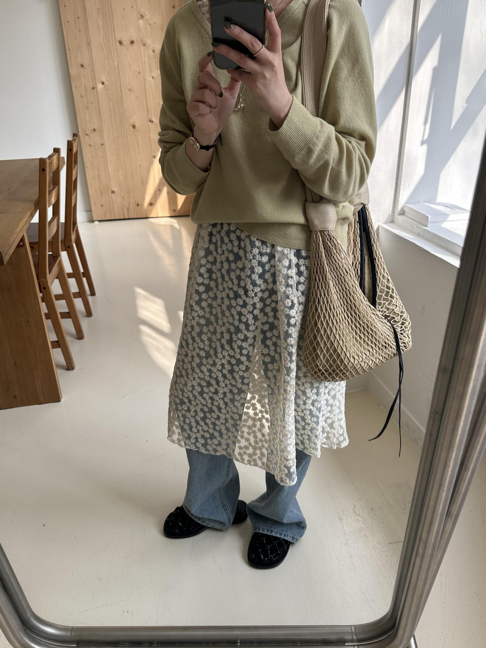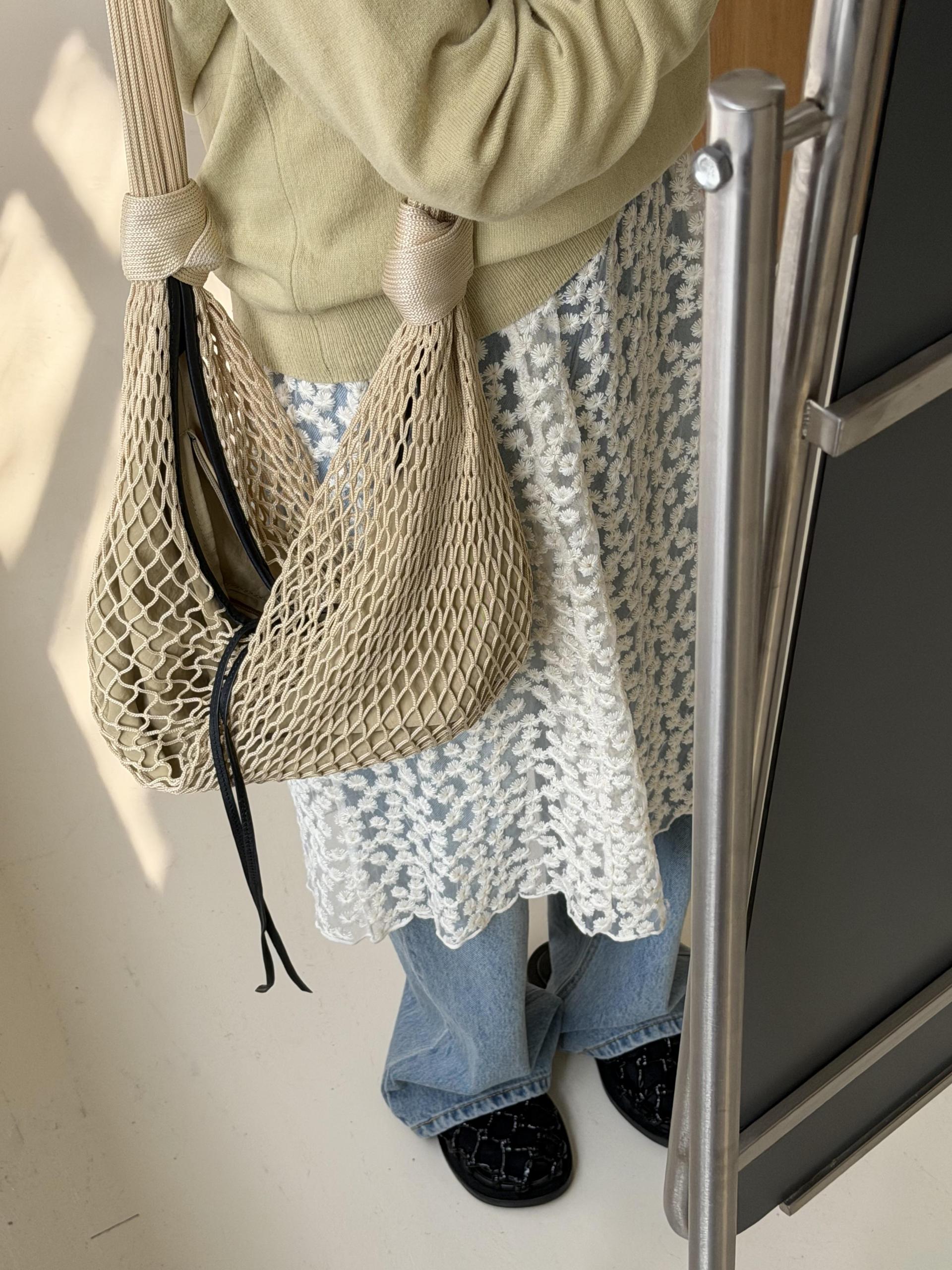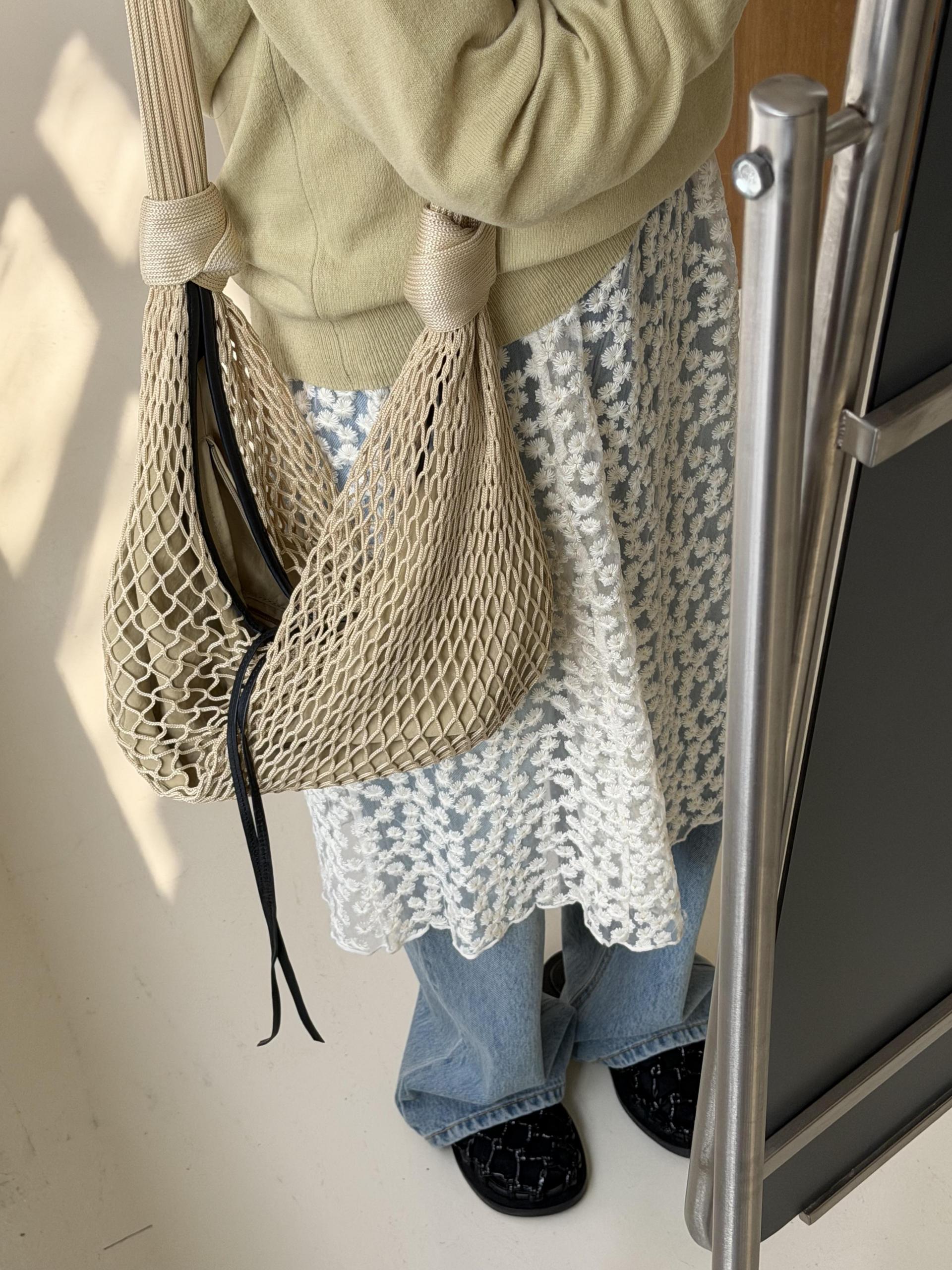 힘이 있는 레이스 원단으로 제작되어 어떤 아이템과 코디하느냐에 따라 무드가 달라져요…!