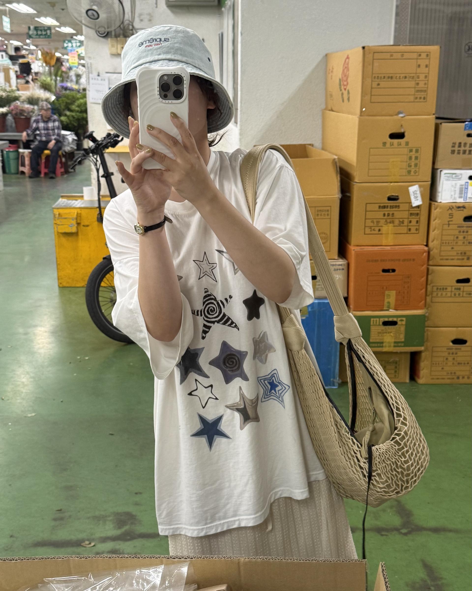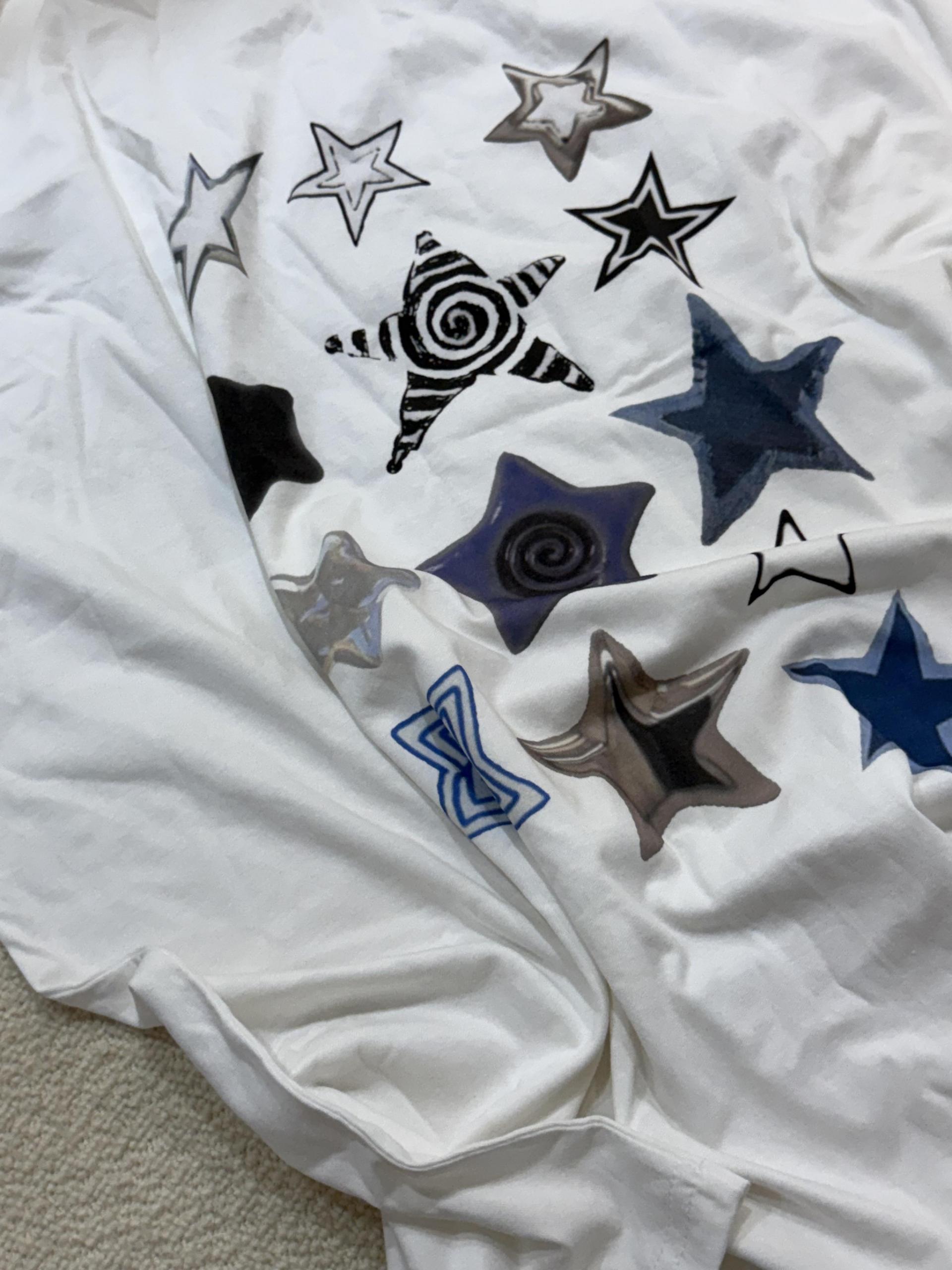 다양한 크기의 별 패턴의 프린팅이 감각적인 오버사이즈 탑 ‘star’ 입니다.